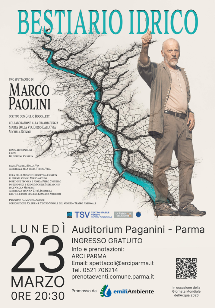 Gli strumenti dell’arte e del racconto per riaccendere l’emozione – e quindi l’attenzione – su una risorsa il cui reale valore sfugge troppo spesso alla nostra percezione. EmiliAmbiente festeggia la Giornata Mondiale dell’Acqua 2026 offrendo ai cittadini del parmense lo spettacolo teatrale Bestiario idrico, di e con Marco Paolini, in programma lunedì 23 marzo alle ore 20.30 all’Auditorium Paganini di Parma: una serata di teatro – a ingresso gratuito su prenotazione – che vuole essere un invito alla riflessione e all’approfondimento, anche in vista delle scelte strategiche che riguardano il futuro di questo bene primario.